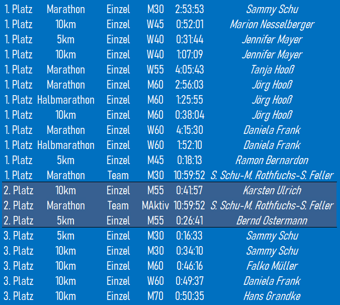 Insgesamt haben wir zum jetzigen Zeitpunkt 81 aktive Läufer/innen, die 1.830 Wettkampfkilometer, bei 187 Wettkämpfen absolvierten. Sammy Schu konnte dabei 4 Läufe als Gesamtsieger für sich entscheiden.
